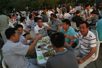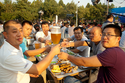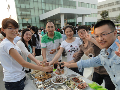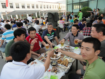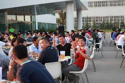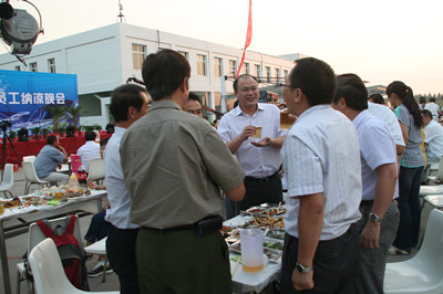 17:30分, “第四屆員工納涼晚會”正式開始。首先是員工聚餐。近400名員工,伴著歡快的樂曲聲,推杯換盞,大快朵頤。公司總經(jīng)理志賀進(jìn)、常務(wù)副總經(jīng)理王正軍等公司領(lǐng)導(dǎo)走入員工中,與員工們親切交談,敬酒祝愿,整個(gè)會場洋溢著一張張歡樂的笑臉。